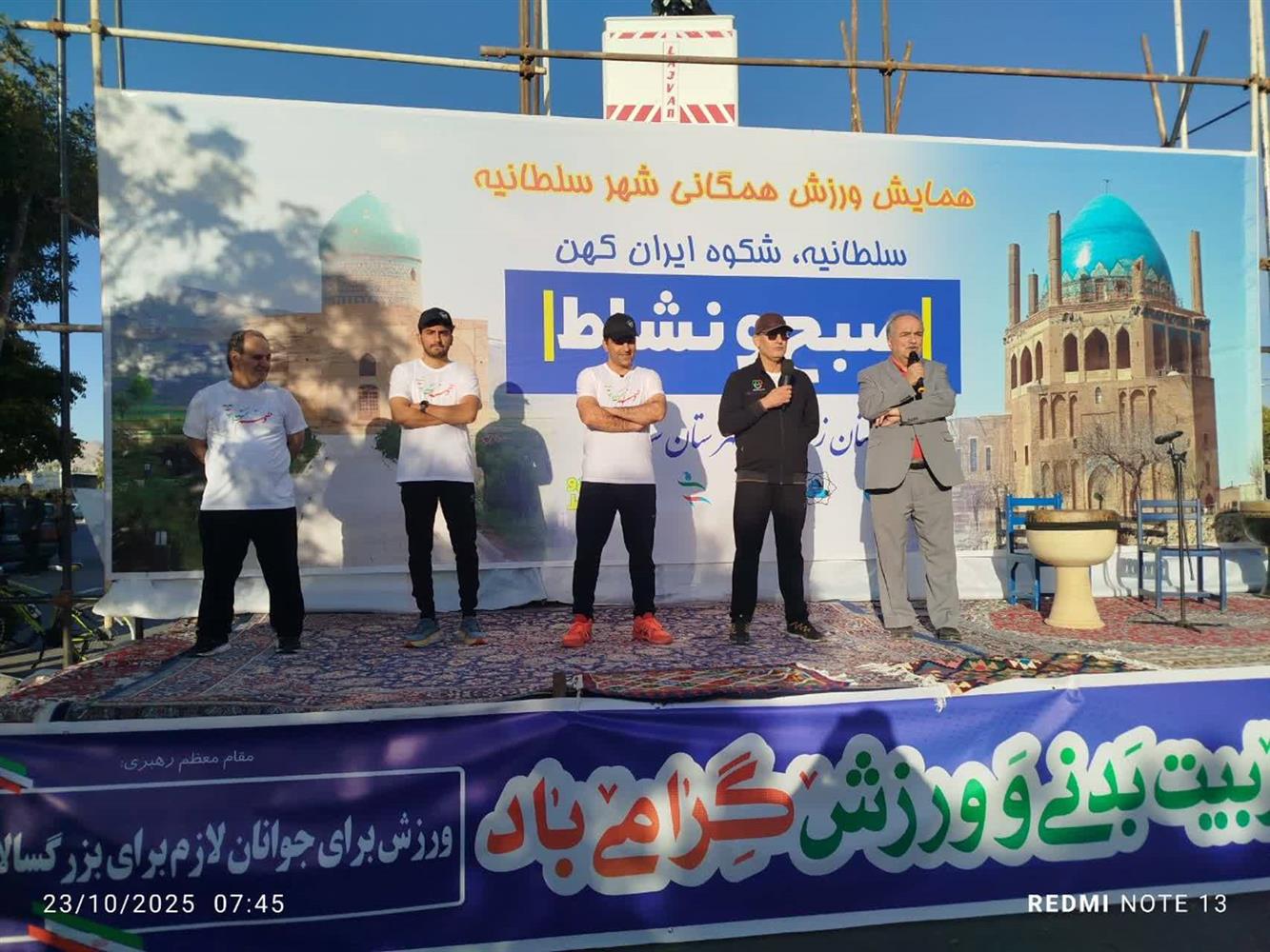 به گزارش روابط عمومی فدراسیون ورزشهای ورزشهای همگانی، همایش بزرگ ورزش صبحگاهی صبح امروز(جمعه) به مناسبت هفته تربیت بدنی و ورزش همایش بزرگ ورزش همگانی با حضور علی خلیلی رییس و علیرضا مهدوی دبیرکل فدراسیون ورزشهای همگانی، فرماندار و شهردار سلطانیه، محمدیپور مدیر کل و امانی معاون اداره کل ورزش و جوانان زنجان، رحیمیزاده رییس هیئت ورزشخای همگانی استان زنجان و مشارکت بیش از ۲ هزار نفری مردم شهرستان سلطانیه برگزار و به صورت زنده از برنامه صبح و نشاط شبکه ۳ سیما و شبکه استانی اشراق پخش شد.